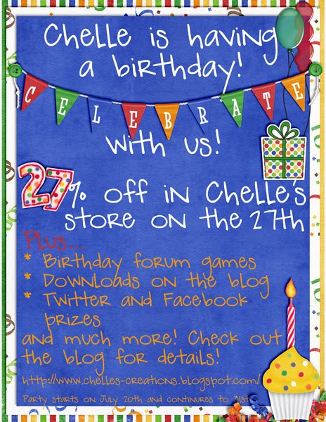 Oh, and one more thing - if you're a fan of Chelle's, you won't want to miss this blog post. You have until Friday to show us one or more of your layouts using Chelle's products, and you'll get the as-yet-unreleased Summer Splash Alpha, plus have a chance to win a gift certificate to Chelle's store!!
